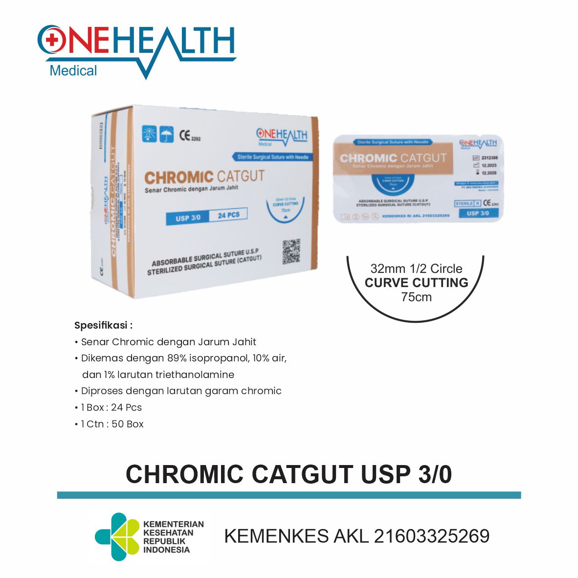 OneHealth Catgut Chromic adalah benang yang dibuat dengan mengolah serat kolagen dari usus hewan tertentu dan kemudian ditambahkan kromium untuk meningkatkan daya tahan di dalam tubuh manusia. Catgut chromic memiliki kelebihan dalam hal daya tahan dan kekuatan tarik yang lebih baik dibandingkan dengan catgut plain.