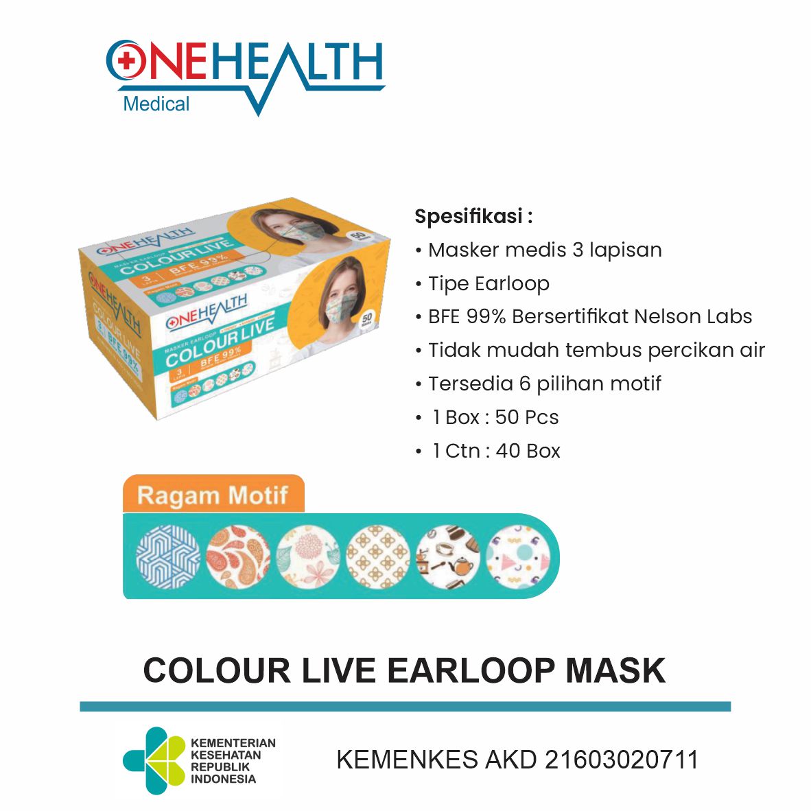 Masker medis 3 lapis Tipe Earloop BFE 99% Nelson Labs Certified Tidak mudah tembus percikan air 1 Box isi 50 Pcs 1 Ctn isi 40 Box 6 Pilihan Motif