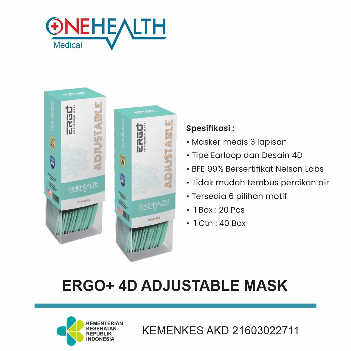 Design 4D Masker medis 3 lapis BFE 99% Nelson Labs Certified Tidak mudah tembus percikan air Kemasan Box isi 20pcs 1 Ctn 40 Box