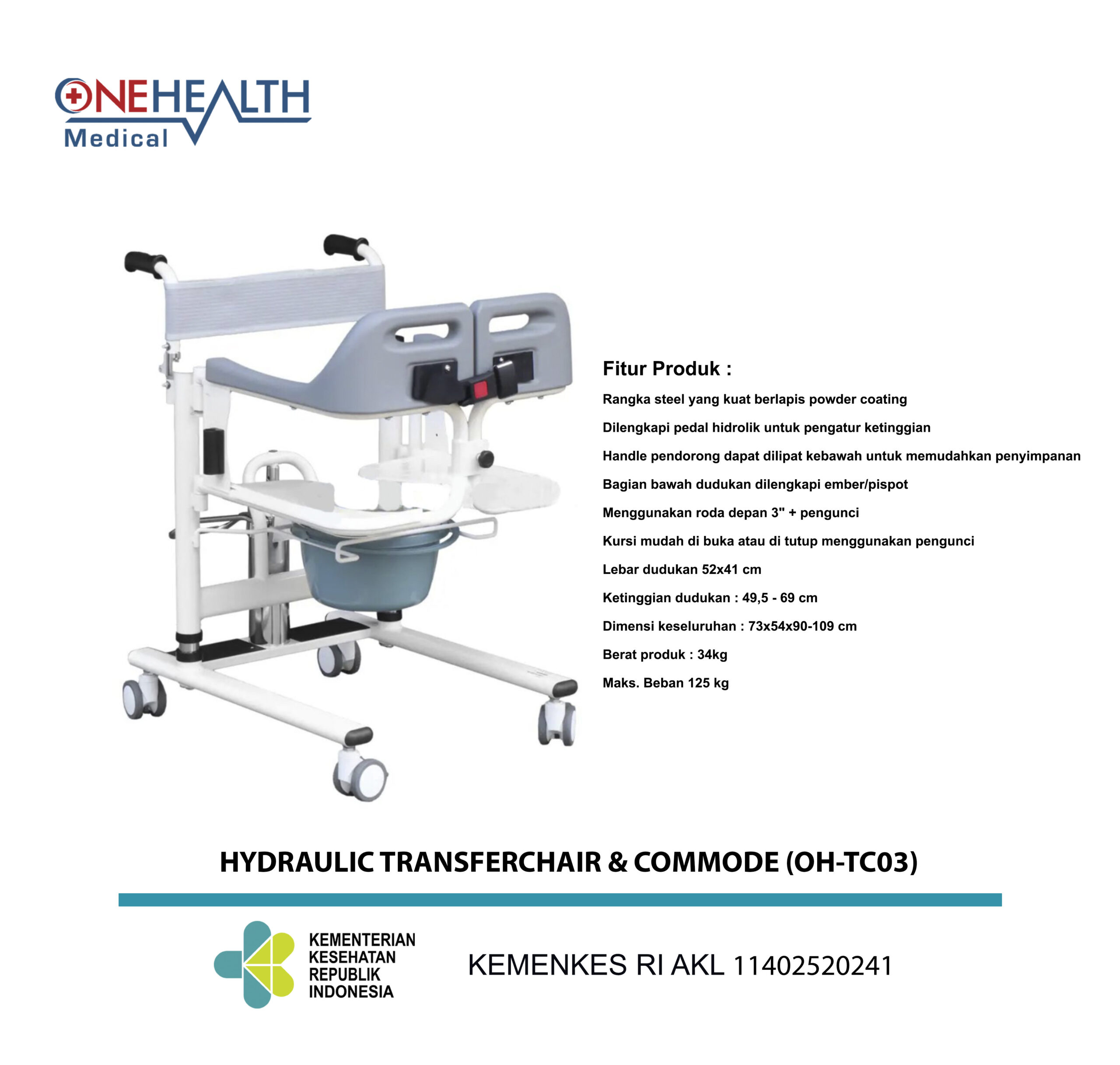 Kursi transfer pasien OneHealth OH-TC03 merupakan alat bantu jalan yang dapat digunakan untuk mobilitas seperti ke kamar mandi, toilet, ruang tamu dan lain-lain. Menggunakan sistem hidrolik untuk pengatur ketinggian sehingga lebih mudah dioperasikan. Kursi bisa buka dan ditutup memudahkan transfer pasien dari suatu tempat ke tampat lain. Dengan bahan steel yang kuat mammpu menahan beban hingga 125kg.