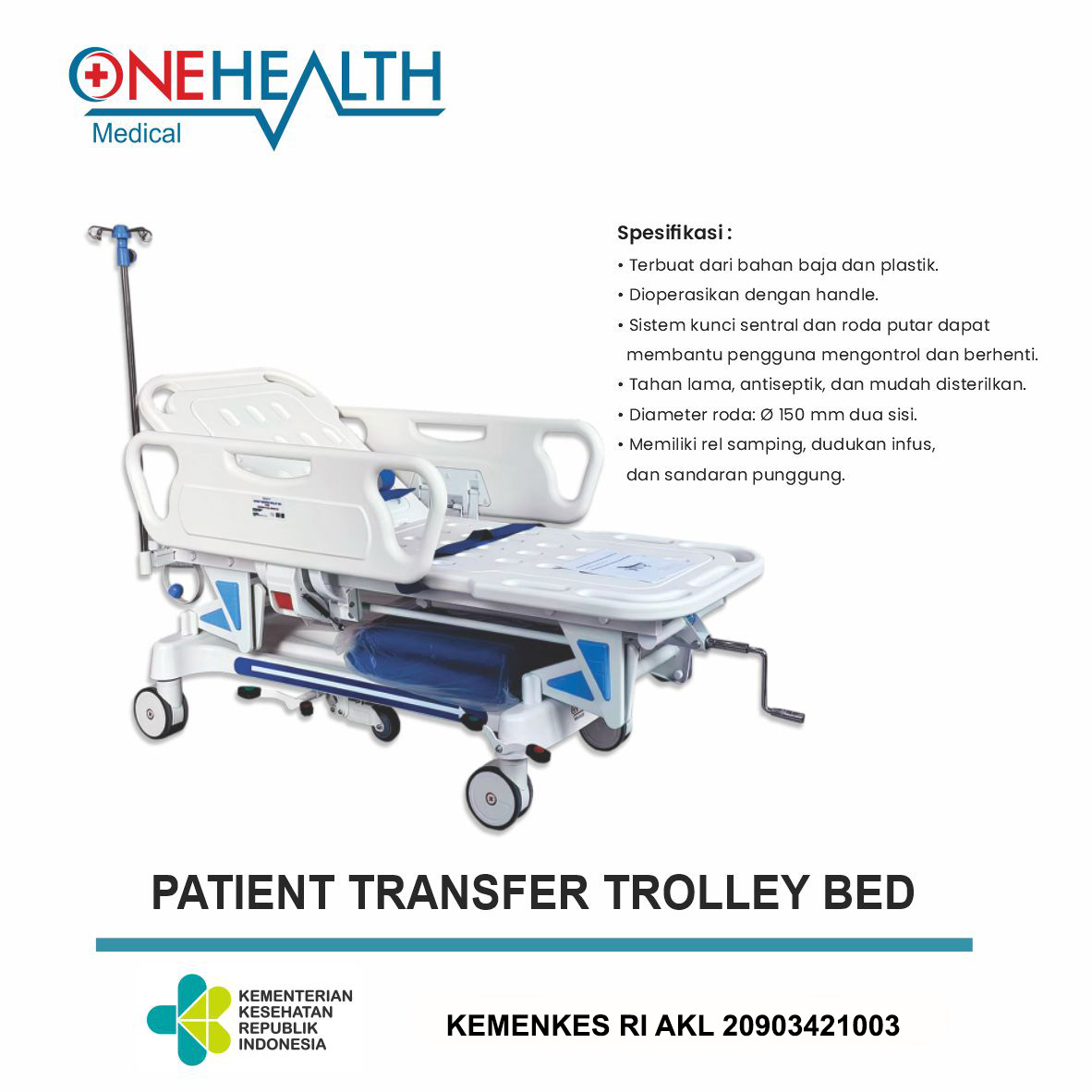 • Memiliki rel samping, dudukan infus, dan sandaran punggung.