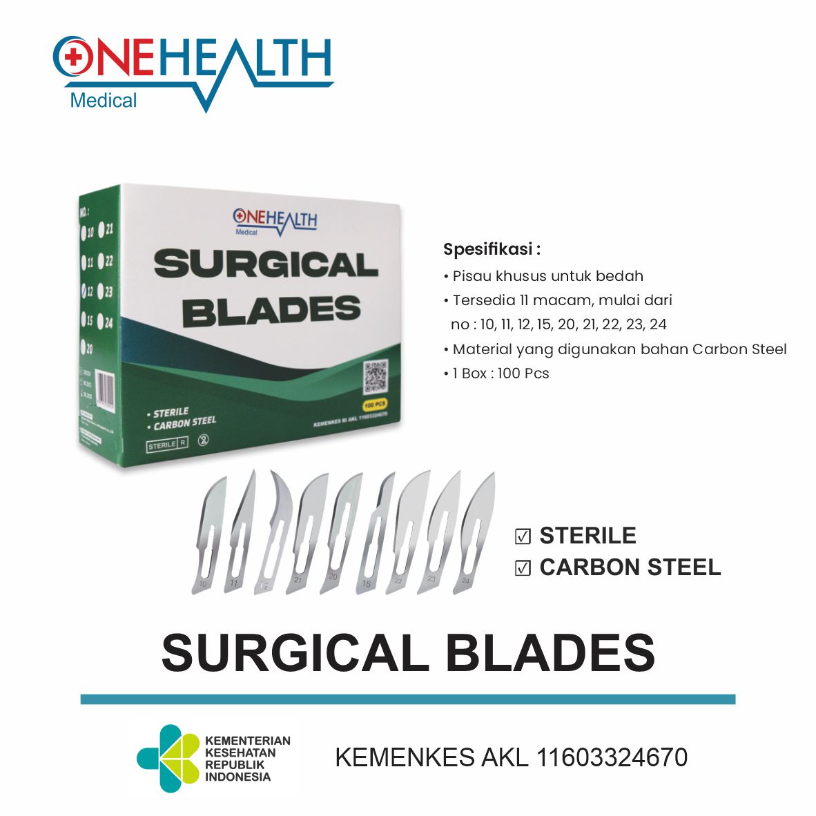Surgical Blades ONEHEALTH No 10,11,12,15,20,21,22,23,24 Mata Pisau Bedah Operasi Sterile Knife Bisturi